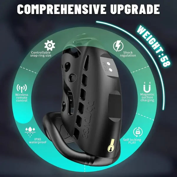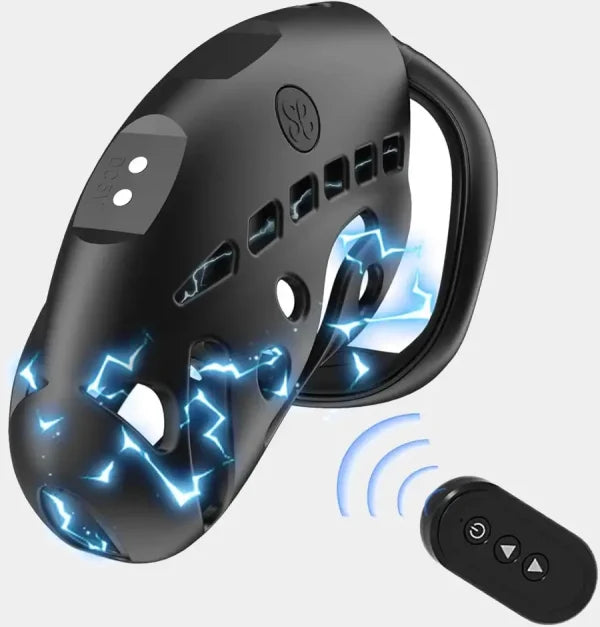 Dominance with a shocking twist: Introducing the Ultimate Remote Controlled Male Chastity Lock with Shock Feature. Experience control and pleasure with this sleek, black device featuring remote access and an integrated shocking feature. Crafted from body-safe materials, its ergonomic design ensures comfort and security. The USB rechargeable system and discreet design make it perfect for extended wear. Elevate your BDSM play with this state-of-the-art chastity lock.