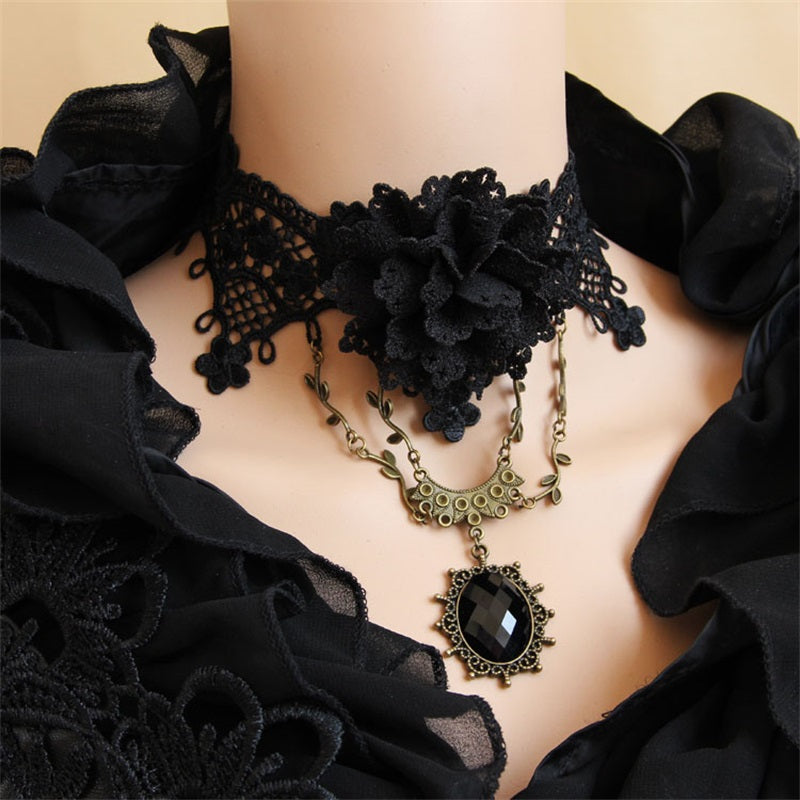 Dark Fantasies, a symphony metal and lace: This exquisite black rose choker epitomizes the essence of gothic elegance. Positioned at the heart of the choker, the roses petals unfold in layers of exquisite lace that evoke a sense of depth and complexity. Dangling gracefully from the choker is a pendant that combines the rich warmth of bronze with the depth of black, creating a striking contrast that is both eye-catching and elegantly understated.