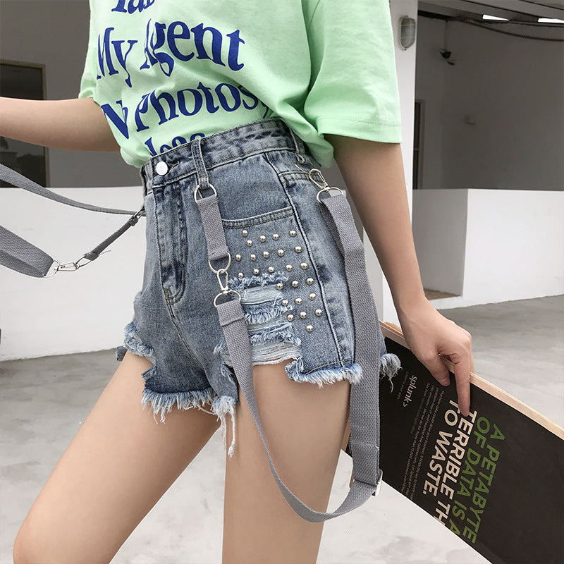 Edgy Rips Meet Playful Suspenders: Featuring carefully placed rips for that sought-after distressed look, these jean shorts exude an air of laid-back rebellion. The detachable suspenders add a playful twist, transforming a classic casual staple into a standout piece. Whether worn with or without the suspenders, these shorts offer multiple styling options to suit your mood and occasion.