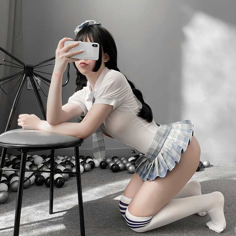 Embrace your inner temptress with our revealing white blouse and blue skirt schoolgirl uniform, and make a statement wherever you go. Perfect for those who dare to embrace their sensuality, whether for cosplay or private fantasies.